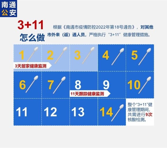 【导语】:南通市目前对部分来通人员执行“3+11”健康管理,即3天居家健康监测+11天跟踪健康监测,期间会进行多次核酸检测,请大家注意,互相转告。