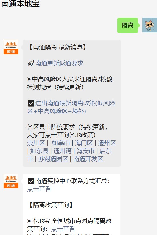 温馨提示:微信搜索公众号【南通本地宝】,关注后在对话框回复【隔离】可获南通高、中、低疫情风险区及境外来南通隔离政策、南通各地防疫要求等信息。