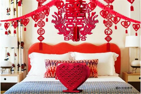 结婚的时候一定要有喜字加持,所以在墙上、窗户上、门框上加上喜字是一直流传下来的装饰方式。有想法的新娘也可以在自己的房间墙上装饰一些代表吉祥的祝福语,简单大气。