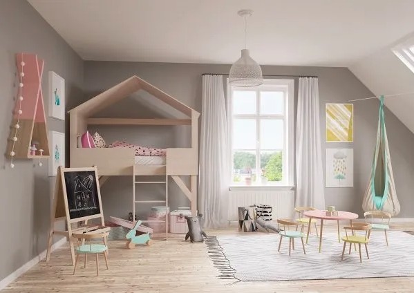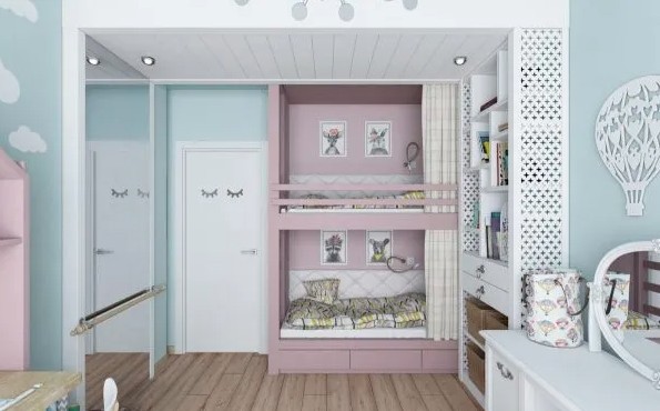 7.二胎家庭,如果房间面积有富裕,还可以设计小型滑梯,家里也可以变游乐园。或者上侧为床,下侧为学习区域,两个小朋友一起学习绘画, 同成长。