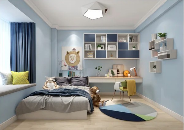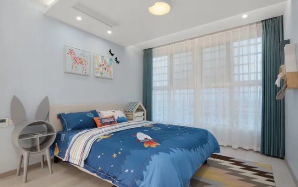 3.儿童房以蓝灰色作为主色调,大床的选择方便家人的陪伴,在床的旁边是半自动遮光纱帘,白天采光充足夜间又不会影响睡眠,给孩子一个舒适的环境。