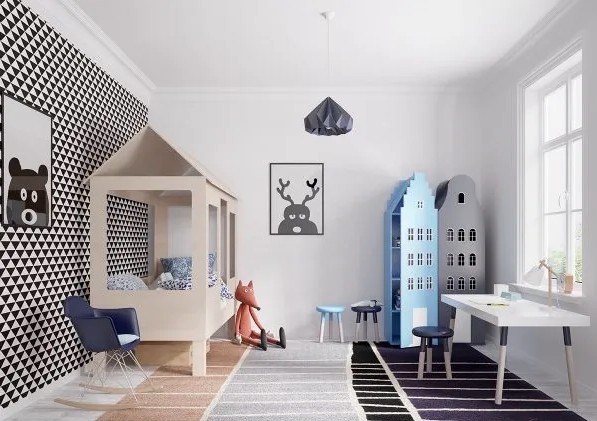 5.孩子的年龄比较小的,可以把儿童房作为娱乐室来使用,不要做笨重的家具,方便孩子长大之后,把儿童房进行改造,有婴儿床加上地毯就好。