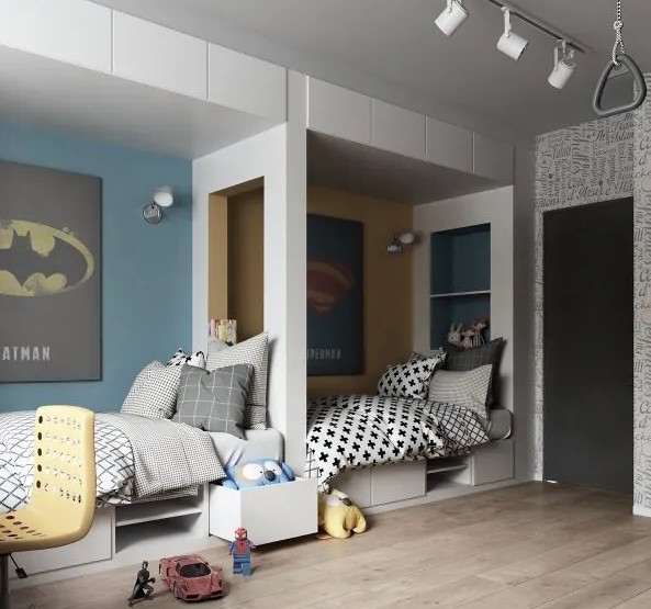 6,这个儿童房虽小却实现了两张床、两个大储物柜、 孩子的玩耍活动空间,两个孩子都有自己的空间,是现实生活中实用的典范。