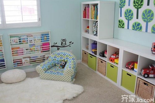 整整齐齐的收纳柜和收纳筐的设计,让孩子的玩具分离整理,小小的角落里购置了宝宝沙发,玩累了还可以在沙发上休息一番。