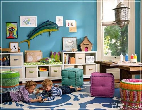 这样的儿童房收纳用品很多,各种收纳筐也能锻炼孩子自己整理的能力和习惯,从色调上看多种颜色的设计也有助于孩子爱上这个私有的游戏空间。