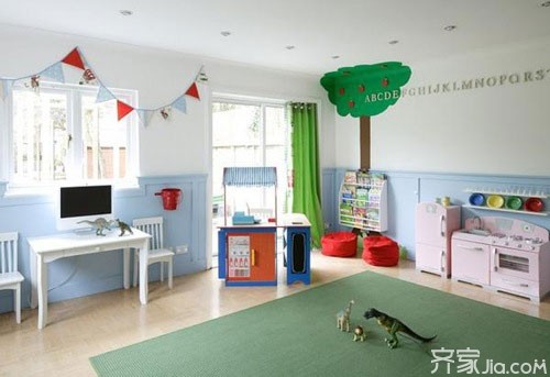 这个儿童房的空间比较大,光线也充足,房间里铺上一块绿色地毯将整个空间显得十分清新。