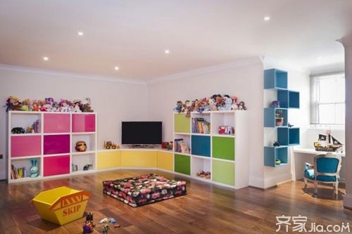 靠墙放置了大量的收纳柜,各种色彩应有尽有,从红色到绿色再到蓝色有利于孩子对色调的认知。