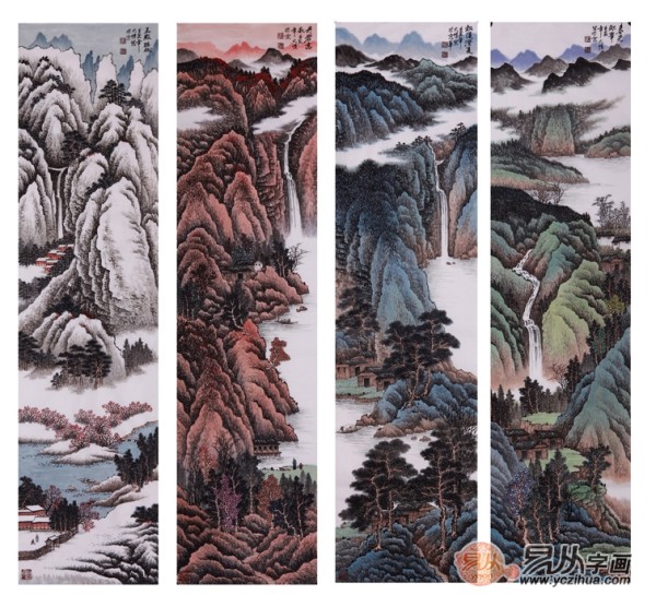 吴大恺手绘装饰画推荐四:四尺条屏山水《春夏秋冬四条屏》