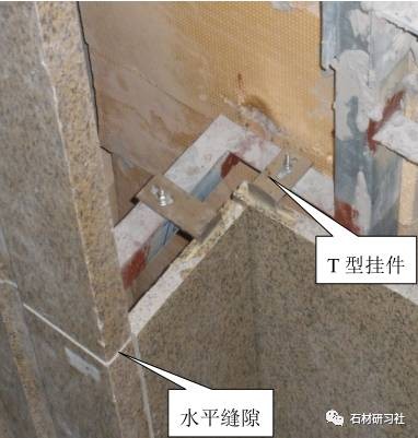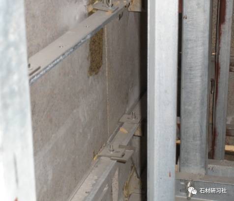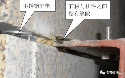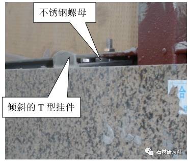 如上实际图片,为了将石材板块之间的水平缝隙保持统一,在上下石材板块的缝隙之间垫有不锈钢螺母、平垫,由于石材板块短槽位置与T型挂件之间留有一定的缝隙,造成T型挂件上部的板块没有完全被T型挂件所托住,所以从理论上独立的板块而实际没有独立。石材研习社(IDstone5a)