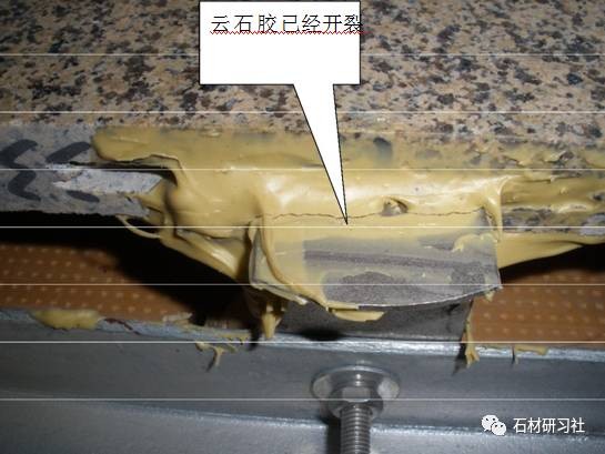 此外还有一个特点,云石胶遇到冷凝水等一系列潮湿水汽的状态下即有可能短时间内失效,而石材板块本身又具有一定的渗水性,无论是大理石还是花岗岩都具有这一特点,现在有的石材板块按照要求做了防护,但也不可能做得完全到位,毕竟这是一个人为的工作过程,还会或多或少的有渗水状况,所以长时间状态下即有可能云石胶与石材及挂件之间出现断裂,由此带来安全隐患的存在。 2、石材板块不具有完全独立性: