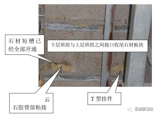如上图所示,这是石材板块安装时通常采用的方法,几乎所有的石材幕墙在下层班组从下自上安装到上层班组开始的位置时,剩下的那一圈接口石材都采用上图的方法,将石材板块的下部短槽全部开通,将整个板块的短槽部位全部填塞石材云石胶,将石材的上部短槽插入T型挂件,下口短槽就采用云石胶快速粘接。这种做法忽视了一个关键问题,那就是云石胶是一种纯结构较,是用来短期、短时间临时固定的结构材料,比较脆硬,不能用来做长时间结构用材料,在长时间使用受力状态下即有坑能断裂,由此带来安全隐患。