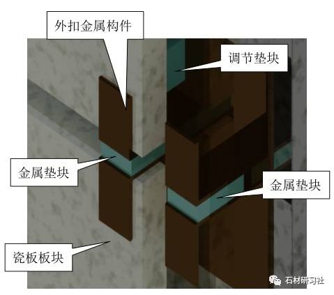 瓷板安装构造示意图2 上图所显示是一个瓷板幕墙的实际构造图,采用的是L型金属构造片将瓷板从板块外侧固定牢固,也就是一个独立的瓷板板块分别由四个金属L型构件固定,其中L型金属构件之间采用硬质金属垫块填塞。通过这个图片的示意,不难分析出,其实它就是根据传统安装石材的T型挂件演变而来,该构造本身一旦组成结构,那就与上面所指出的石材安装实际相统一,造成所有的瓷板板块从下自上是一整块瓷板,同时构件是紧紧的将瓷板固定,瓷板与构件之间没有任何的可移动性,这样的瓷板在施工安装后又该如何实现可以拆装的要求呢,其实这个构造根本就无法实现。由此说瓷板与石材应该统一结构措施,无论如何去安装,都必须满足可拆卸安装措施,满足抗震要求措施。 来源网络,仅供学习参考