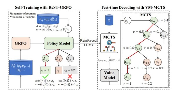 ReST-RL 为解决训练奖励差异和 PRM 准确性问题,提供了新的可能。该方法由两个主要部分组成,分别是 ReST-GRPO(基于群体相对策略优化的强化自训练方法) 和 VM-MCTS(基于价值模型的蒙特卡洛树搜索)。