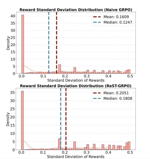 与普通 GRPO 相比,ReST-GRPO 能够显著提升训练过程中的奖励方差。