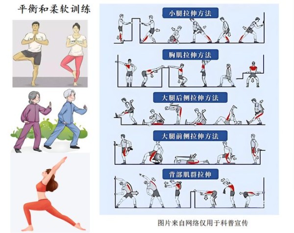 运动前5~10分钟关节活动、快走等热身和运动后10分钟左右的静态拉伸可降低损伤风险和肌肉酸痛。健身中如出现头晕、胸闷、疼痛等应立即停止运动,必要时就医。健身应兼顾有氧运动、力量训练、平衡和柔软性训练,全面提升身体素质。健身应循序渐进,从短时间、低强度开始,每周增加不超过10%的运动量。
