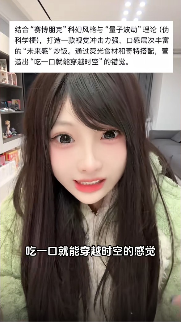 推荐她做一道通过荧光食材实现,结合“赛博朋克”科幻风格与“量子波动”理论,且视觉冲击力强的“未来感”炒饭。食材包括荧光鱿鱼(鱿鱼+食用荧光素)、黑色番茄、蚂蚁卵、紫色胡萝卜等猎奇原料。