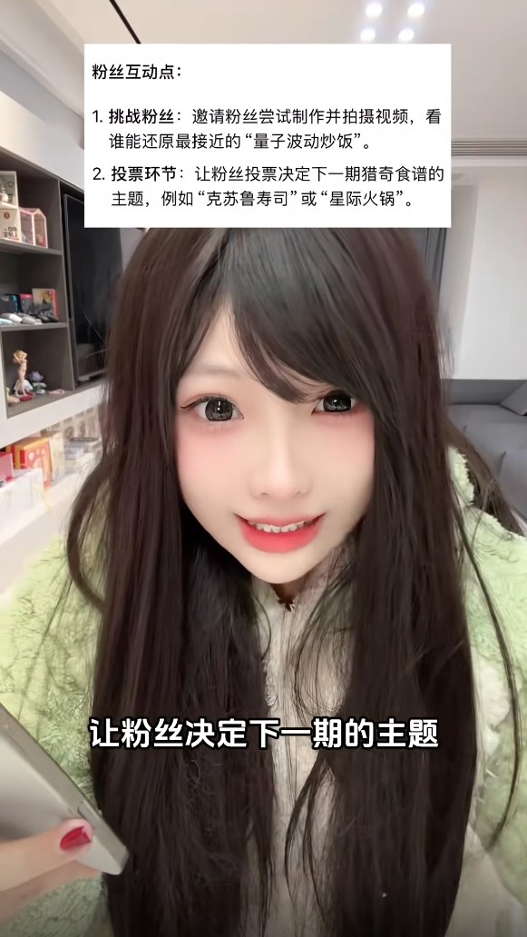 AI甚至给她准备好了下一期视频主题:粉丝挑战还原这道美食,或是更新下一期猎奇食谱“克苏鲁寿司”或“星际火锅”,照这么发展下去,以后主播称AI的“替身”了。