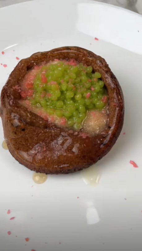 再把芒果和山葵膏按5:1比例混合,再来一点海藻酸钠,滴入微量叶绿素铜钠盐调至荧光绿色,然后把它滴到有乳酸钙的水里,最后涂上陈醋与琼脂做成的透明啫喱,以“超导磁悬浮方式”撒上金箔跳跳糖,就得到了这份卖相尚可的甜品。