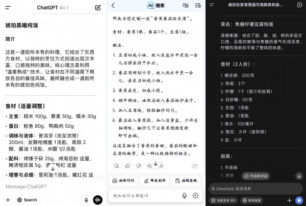 ChatGPT给出的是“琥珀晨曦炖饭”,用“温差熟成"技术,让食材在不同温度下,融合成一道前所未有的琥珀色炖饭;抖音AI给出的是“香蕉番茄烩豆腐”,这道菜融合了香蕉的香甜、番茄的酸甜和豆腐的嫩滑;DeepSeek给出的是“焦糖柠檬豆腐炖蛋”,称结合了甜、酸、咸、鲜的多层次口感。