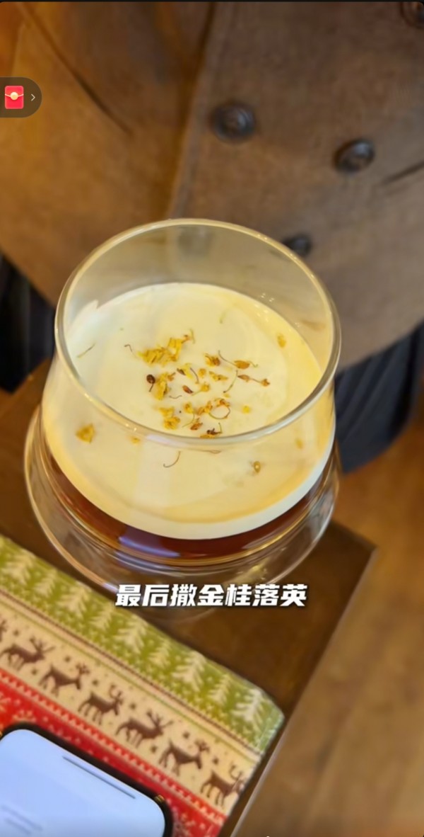 用干龙眼、醪糟米酒(去米版)、桂花糖浆、竹盐制成凝香基底,沿杯壁缓缓注入冷萃咖啡形成琥珀色月晕效果,用茶笼或叉子,快速揽拌奶油至半发泡,以毛笔蘸取微量竹盐,在奶油层写个篆体的“桂”字,最后撒金桂落英,插一枚竹制茶匙。