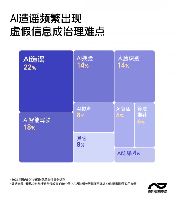 据南都大数据研究院统计,他们在爬取分析过2024年百度新闻中搜索热度较高的国内AI风险事件报道后发现,50个与AI应用相关的舆情案例中,有1/5都是由AI生成的谣言。