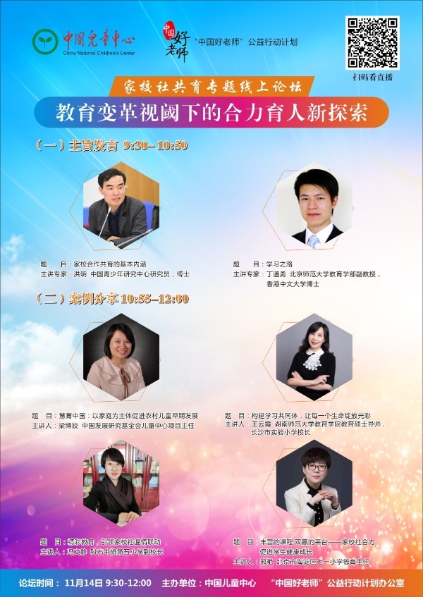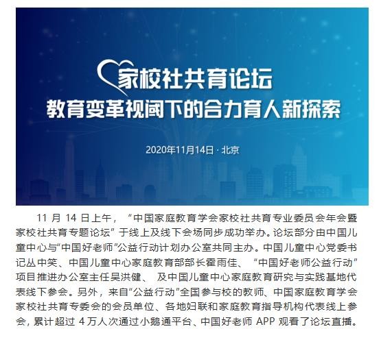 家校社共育论坛|教育变革视阈下的合力育人新探索中国家庭教育学会家校社共育专委会年会暨家校社共育论坛,为推进家校社协同共育工作,探索家庭、学校、社会合作共育的机制和模式,专委会年会和论坛部分通过小鹅通进行了现场直播,其中论坛部分由中心与北师大。