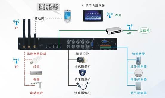 是生活平方系统的管理核心,与触屏操作终端之间通过WIFI网络连接,责管理摄像机、报警传感器和灯光电器控制器;同时,通过互联网和移动网,实现远程视频监控、手机移动控制等功能;