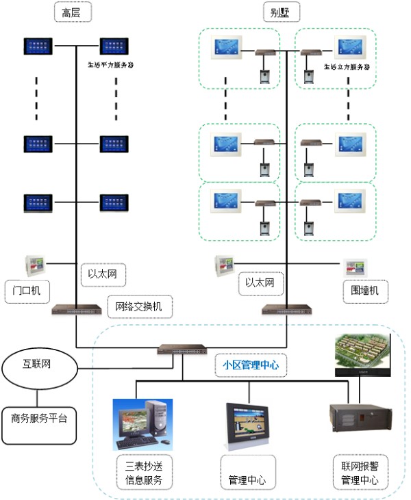 数字社区解决方案基于生活平方智能家居系统和高速宽带网络入户构建,系统原理图如下图所示: