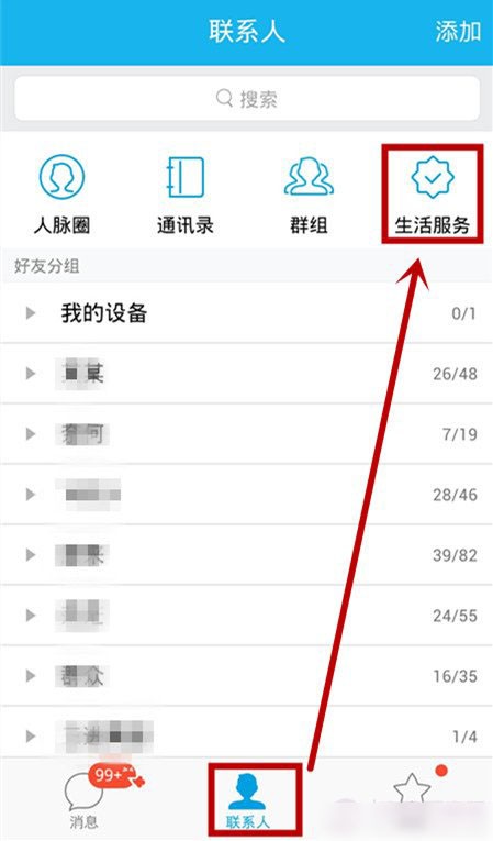 第一步、进入手机QQ,点击“联系人”界面后,选中右上角的“生活服务”。