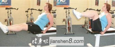 起始姿势:背部要挺直,目视前方,坐在长凳边上,双手握住臀部两侧的凳子,然后身体后仰30度,将双脚抬离地面,膝关节略微弯曲,两腿略屈并前下伸。
