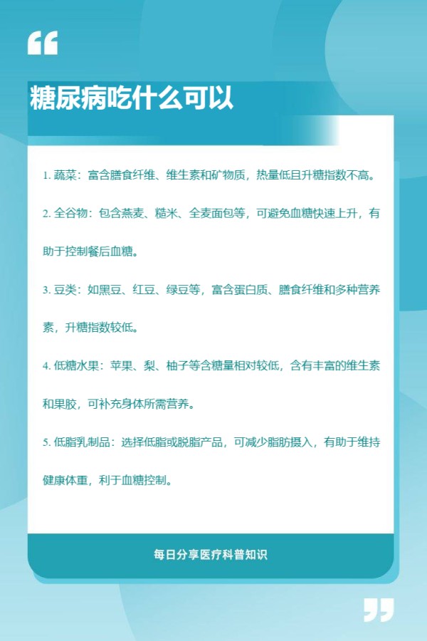 糖尿病可食用的食物有蔬菜、全谷物、豆类、低糖水果、低脂乳制品等。