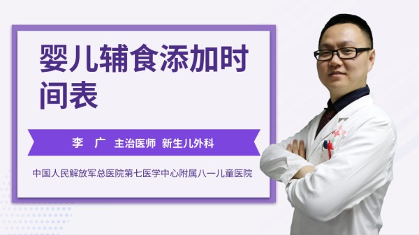 婴儿辅食添加时间表 对于孩子来说,他早期接触的是母乳,还有就是奶粉为主,我们添加辅食的目的主要是促进他的味蕾,还有味觉系统的发育。一般来说,从国际卫生组织,还有就是我们卫计委的要求来说,大概就是4个月左右就可以添加辅食。一般来说顺序就是按照,以汁、泥、末、碎为主这个顺序,1-3个月的时候,我们可以添加一些果汁为主。大概4-6个月的时候,添加一些果泥、蔬菜泥、还有一些肉泥等,这样的话有助于孩子的味蕾发育。大概7-9个月的时候,我们可以添加一些肉末,还有就是蔬菜末,还有一些相应的饼干渣等,这种情况。最后一个阶段,快到一岁的时候,我们就可以添加一些比较大的块状物,比如一些蔬菜块还有水果块,还有就是一些肉块等,但是注意就是不要太大。主要在孩子的咀嚼范围内,所以说我们添加辅食,是一个循序渐进的过程。我们也要根据孩子的情况而定,添加的目的很明确,主要就是对于孩子各方面发育有帮助,当然不要说太晚添加辅食,这样的话防止孩子对于奶出现过度的依赖。 02:11 李广 主治医师陆军总医院附属八一儿童医院 2018-10-09 164484次