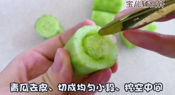 鸡肉切末,洋葱切丁,青瓜去皮切段挖空中间备用。