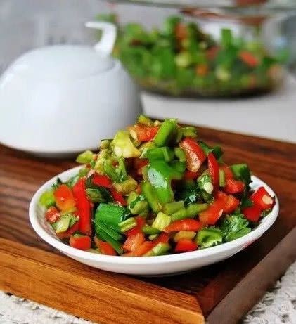 【用料】韭菜1把、香菜1棵、红尖椒1个、尖椒1个、食盐适量、味精适量、香油适量、酱油适量