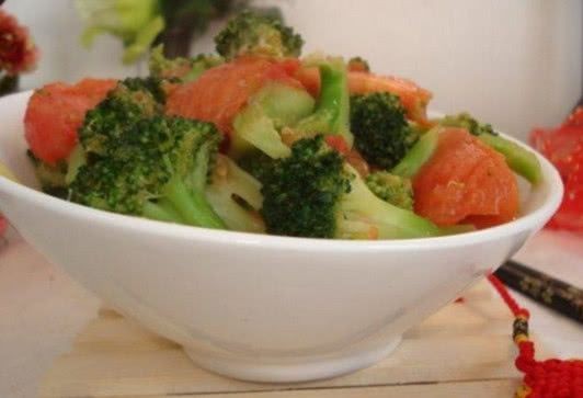 【材料】西兰花1棵,西红柿1个,葱姜蒜少许,生抽盐,糖