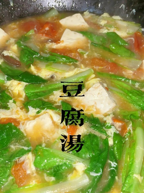 3. 加入豆腐和青菜,再煮5分钟,最后加盐和鸡精调味,搅拌均匀即可。