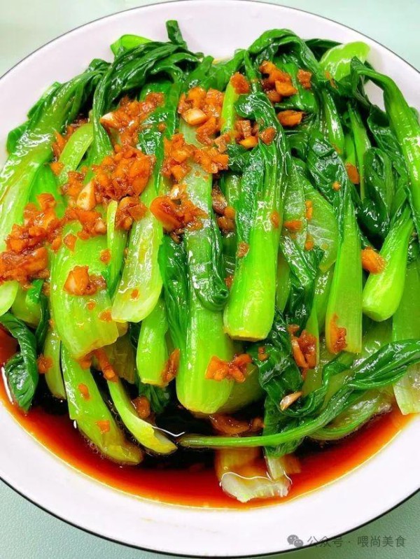 5、将调味汁淋在小白菜上,即可上桌享用。