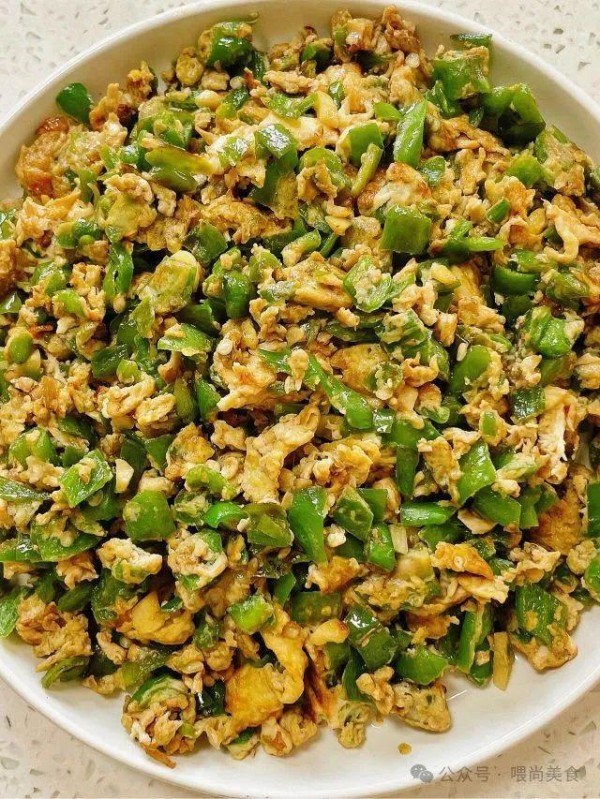 3、将炒好的青椒倒入鸡蛋液中,充分搅拌融合。