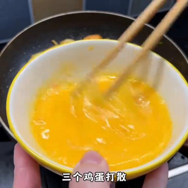 →三个鸡蛋打散倒在锅里,小火慢慢的煎,勺子推一推让它受热均匀。