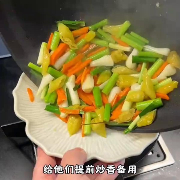 →准备酸菜、蒜苗、小米辣,提前炒香备用。
