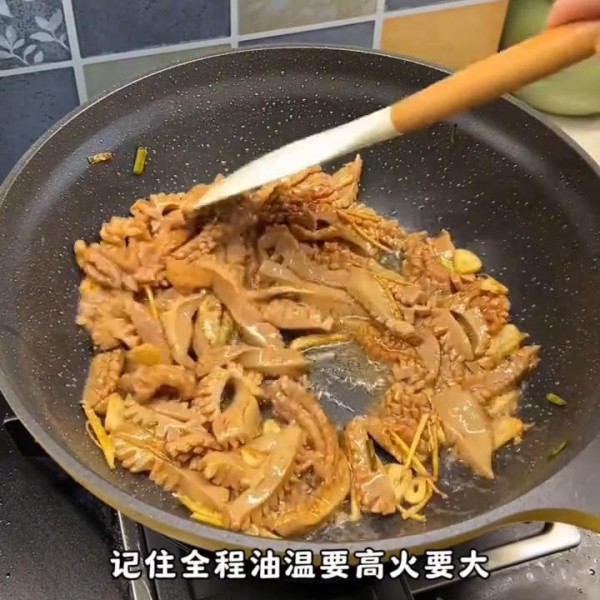 →葱、姜、蒜,再把腰子炒到定型,记住全程油温要高火要大。