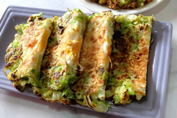 煎的过程中不能太大火,中小火即可。圆白菜丝尽量切得细一些,还可以加一些胡萝卜丝,会更好看。