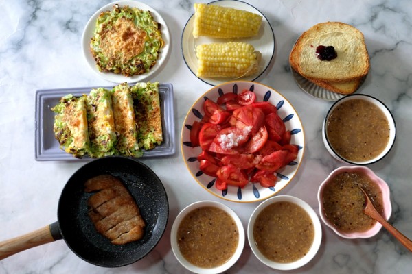 早餐一:糖拌番茄、杂粮米粥、圆白菜鸡蛋饼、面包抹蓝莓酱、煎鸡排。