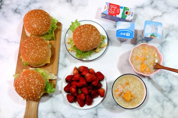早餐二:牛奶酸奶、红薯米粥、草莓、鸡排炒蛋汉堡。