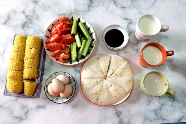 早餐三:牛奶、玉米、桂花米发糕、番茄黄瓜、煮鸡蛋。