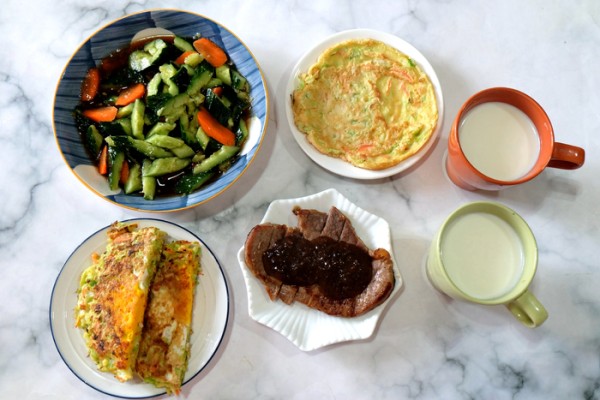 早餐四:牛奶、圆白菜鸡蛋饼、牛排、拍黄瓜。