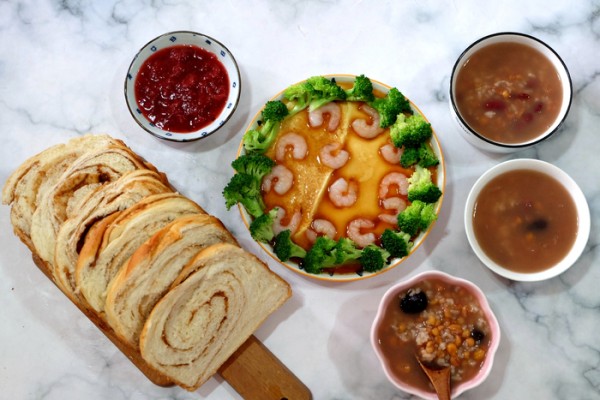 早餐五:骨汤虾仁鸡蛋羹、豆沙面包、芸豆玉米粥、草莓酱。