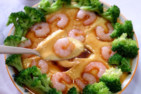 孩子们喜欢的鸡蛋羹,这次没用温水,而是用了熬制的骨头汤。3个鸡蛋打在碗里,搅拌均匀,倒入300g过滤好的骨头汤,搅拌均匀后倒入盘子里,撇去浮沫,盖上保鲜膜,开水上锅,先蒸8分钟,撕去保鲜膜,摆上虾仁,盖上锅盖继续蒸3分钟,然后焖5分钟。蒸好以后取出,四周摆上焯过水的西兰花,再用香油和生抽酱油拌成料汁淋在蛋羹上。营养丰富口感鲜嫩,孩子们可喜欢吃了。