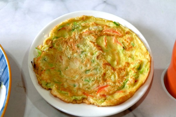 又做了圆白菜鸡蛋饼,不过这次加了胡萝卜丝,孩子们说更好吃了。还是把圆白菜切丝、胡萝卜切丝,加1个鸡蛋、少许面粉、少许盐搅拌均匀,平底锅烧热后刷油,放圆白菜糊,中间空出一个圆形,原本一个鸡蛋,一面煎熟后翻面,两面熟透即可。