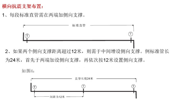 8.3.3每段水平直管道应至少设置一个纵向抗震支架,当两个纵向抗震支架距离超过最大设计间距时,应按本规范第8.2.3条要求间距依次增设纵向抗震支架。